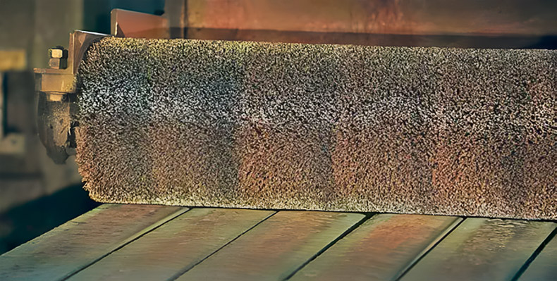 钢丝毛刷辊中添加金钢砂等特殊材料,其耐磨度上更胜尼龙丝一筹。因为其具有耐酸,耐碱等特性,主要应用在钢铁业或其它五金行业,用来对钢板的清洁去锈去氧化皮,钢材的初加工,镀锌钢板的生产,钢板彩涂,其它铸造件的去毛刺打光处理,钢带、铝带、铜带等产品的抛光处理和镜面效果处理等行业。